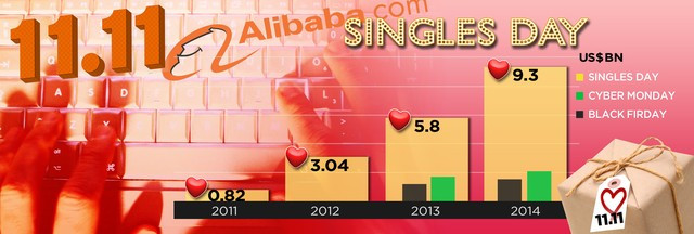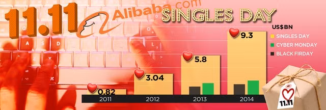 Năm ngoái, Alibaba đạt được doanh thu kỷ lục 9,3 tỷ USD, cao gấp hơn 4 lần so với con số 2,4 tỷ USD của ngày Cyber Monday là ngày bán hàng trực tuyến giảm giá lớn nhất ở Mỹ.