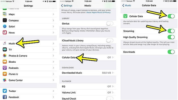 Bạn vào Cài đặt > Nhạc > chuyển dữ liệu di động từ On sang Off các mục như Stream, High quality streaming, Dữ liệu di động.