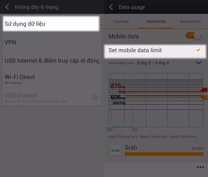 Sau đó chọn Set mobile data limit để cài đặt mức giới hạn, khi lưu lượng sử dụng trên điện thoại đạt đến mức này, thiết bị sẽ tự động ngắt kết nối. Điều này sẽ giúp người dùng cảm thấy an tâm hơn khi sử dụng dịch vụ mạng.
