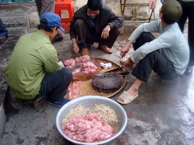 Nét độc đáo của món nem ở đây là thịt lợn xẻ ra còn nóng hổi, không đem rửa lại với nước mà băm nhuyễn luôn khoảng 1h thì phần xương, thịt lợn, tủy hòa vào nhau tạo nên độ dẻo, dính. Phần bì lợn được cạo sạch lông, luộc chín, thái mỏng. Sau đó các nguyên liệu được trộn với nhau cùng với tỏi, ớt, nước mắm, mì chính và thính gạo rang.