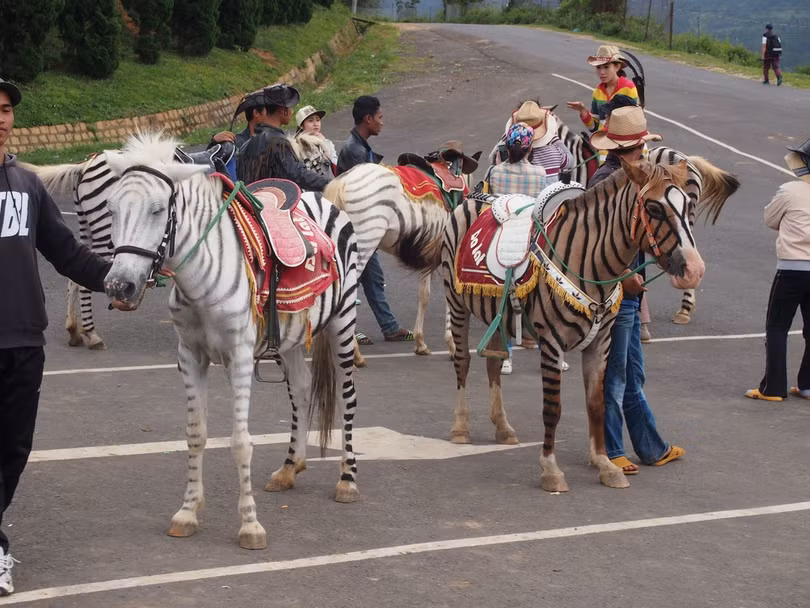 Leo lên đỉnh núi Lang Biang đối với du khách nước ngoài là một trải nghiệm khá thú vị và… mệt. Nhưng phần kỳ lạ với du khách nước ngoài lại là khu vực đậu xe, nơi người dân đã sơn ngựa của họ giống như những con ngựa vằn. Rõ ràng, ngựa vằn giả ít đe dọa du khách hơn ngựa vằn thật.