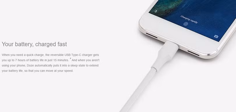 Pixel và Pixel XL có pin lần lượt 2.770 mAh và 3.450 mAh, hỗ trợ sạc nhanh với cổng USB Type-C đời mới. Chỉ cần nạp điện 15 phút, máy cho phép hoạt động thêm được tới 7 giờ.