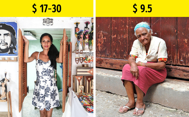 Tiền lương hàng tháng của người Cuba trung bình là 17-30 USD, trong khi lương hưu hàng tháng là 9,5 USD. Mỗi tháng người dân được cung cấp một giỏ chứa trứng, một lít dầu thực vật, 2 kg đường và gạo, một ít thịt, gà, cá và xúc xích.