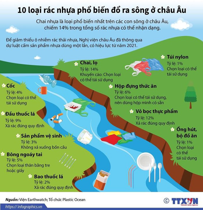 Chai nhựa là loại phổ biến nhất trên các con sông ở châu Âu, chiếm 14% trong tổng số có thể nhận dạng. Nghị viện chây Âu đã thông qua dự luật cấm sản phẩm nhựa dùng một lần từ năm 2021./.