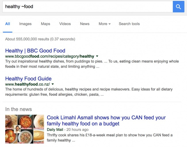 Ví dụ như, nếu bạn tìm kiếm cụm “lành mạnh ~ thức phẩm”, bạn sẽ có được kết quả về cách ăn uống khỏe mạnh, công thức nấu ăn cũng như những lựa chọn ăn uống tốt cho sức khỏe.