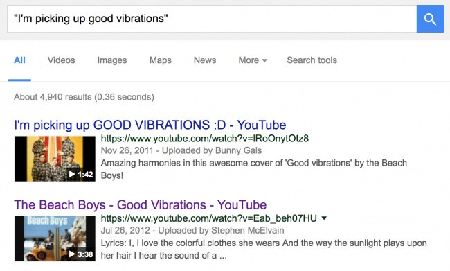 Đặt cụm từ tìm kiếm vào trong dấu ngoặc “ ” là cách đơn giản và hiệu quả nhất để kiếm kết quả chính xác cho cụm từ đó. Đây là một cách tuyệt vời để tìm lời một bài hát khi bạn chỉ biết một câu trong đó.