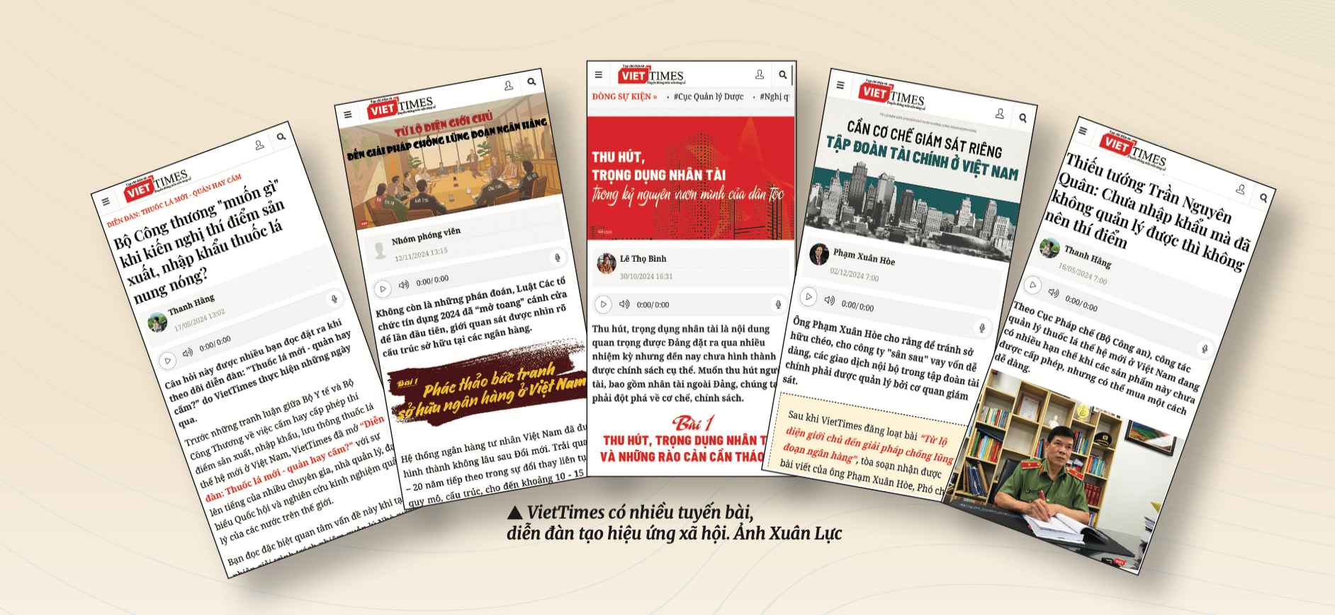 Tương tự, khi VietTimes mở Diễn đàn về “Thuốc lá mới - Quản hay cấm?”, “Người chậm nộp thuế bị cấm xuất cảnh”…, mỗi bài viết nhận hàng trăm bình luận của bạn đọc chia sẻ câu chuyện thật, tạo nên một diễn đàn công khai, nơi tiếng nói của người dân được lắng nghe. Hay loạt bài “Lộ diện giới chủ và những giải pháp chống lũng đoạn ngân hàng” cũng thu hút hàng trăm ngàn lượt xem, hàng trăm bình luận, khẳng định bản lĩnh phản biện và niềm tin công chúng vào tờ báo.