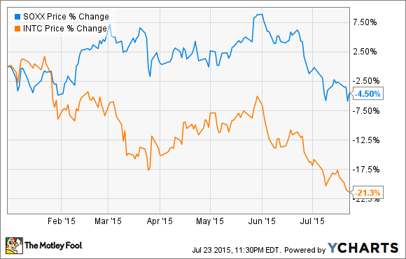 Giá cổ phiếu lao dốc của Intel (đường màu cam)