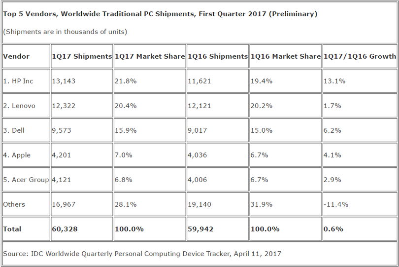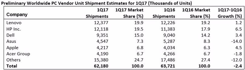 Trong quý 1/2017 này, 6 nhà sản xuất PC hàng đầu lần lượt là Lenovo, HP, Dell, Asus, Apple, và Acer. Theo số liệu của Gartner, trong số 6 nhãn hiệu hàng đầu này, Asus và Acer sụt giảm rất mạnh, các hãng còn lại tăng nhẹ. Toàn thị trường giảm 12%.
