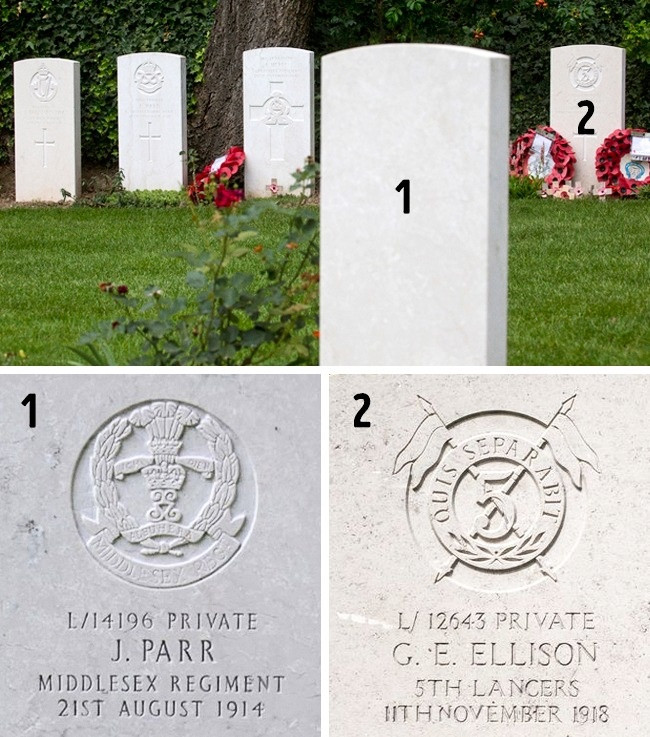 Những ngôi mộ của những người lính Anh đầu tiên và cuối cùng bị giết trong Chiến tranh thế giới thứ nhất nằm cách nhau 6 mét, và những viên đá của họ đối mặt nhau. Sự sắp xếp này không phải là sự sắp xếp ban đầu mà là sự trùng hợp ngẫu nhiên.