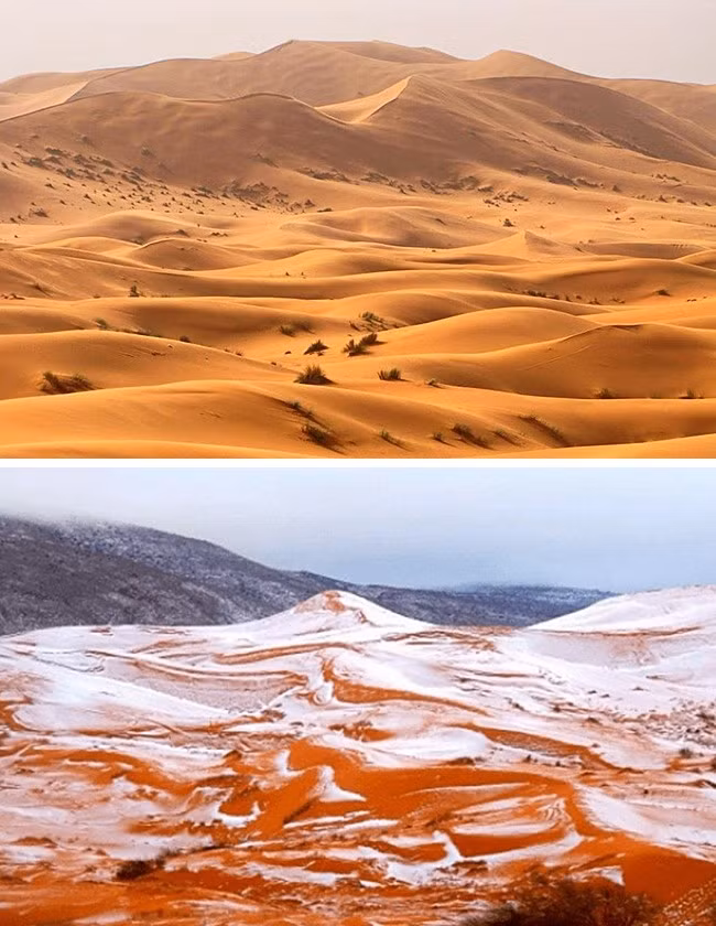 Có thể bạn không tin nhưng đây chính là tuyết trên sa mạc nóng bỏng của châu Phi. Vào tháng 1/2018, một lớp tuyết dày đã bao phủ Sahara. Biến đổi khí hậu nghiêm trọng có thể đưa mùa đông đến cả những vùng nhiệt đới nóng nhất!