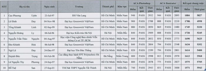 Danh sách 10 thí sinh giành quyền góp mặt tại vòng chung kết quốc gia cuộc thi Danh sách 10 thí sinh xuất sắc nhất ở vòng sơ khảo quốc gia cuộc thi Vô địch Thiết kế đồ họa thế giới - Adobe Certified Associate World Championship - ACAWC 2018 mới được Ban tổ chức công bố gồm có: Cao Phương Uyên, Đại học Văn Lang; Lê Đình Duy, Đại học Greenwich Việt Nam; Tống Khánh Linh, Đại học Greenwich Việt Nam; Nguyễn Hoàng Ly, Đại học Kiến trúc Hà Nội; Nguyễn Trần Thảo Nguyên, Học viện Công nghệ Bưu chính Viễn thông cơ sở TP.HCM; Đào Khánh Hòa, Đại học Greenwich Việt Nam; Ngô Lê Duy, Đại học Tôn Đức Thắng; Huỳnh Đức Trọng, Cao đẳng thực hành FPT Polytechnic Đà Nẵng; Lê Nguyễn Thy Phương, Đại học Greenwich Việt Nam; và Đỗ Tuệ San, trường THCS & THPT Nguyễn Tất Thành.