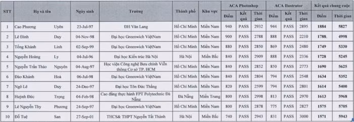 10 thí sinh nêu trên là những thí sinh đã đạt thành tích cao nhất trong vòng sơ khảo quốc gia cuộc thi Vô địch Thiết kế đồ họa thế giới 2018 được IIG Việt Nam - đại diện quốc gia của Certiport, tổ chức vào ngày 13/5 vừa qua tại Hà Nội, Đà Nẵng, TP.HCM. Vòng sơ khảo quốc gia đã thu hút sự tham dự của gần 120 thí sinh đại diện cho đội tuyển của 30 trường THPT, Cao đẳng, Đại học trong cả nước.