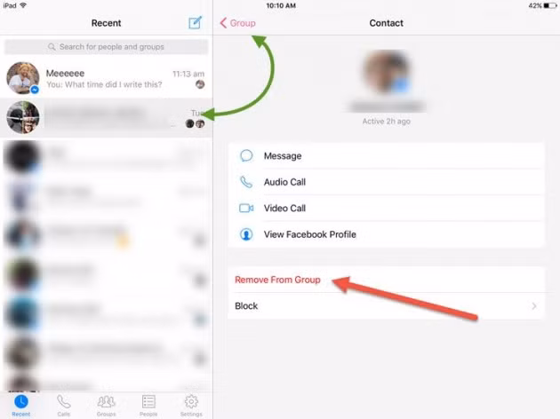 Trên iOS, để loại bỏ bất kỳ người nào, bạn chỉ cần click vào cuộc hội thoại, click vào tên nhóm ở trên màn hình, tại đây bạn có thể loại bỏ bất kỳ người nào trong cuộc hội thoại.
