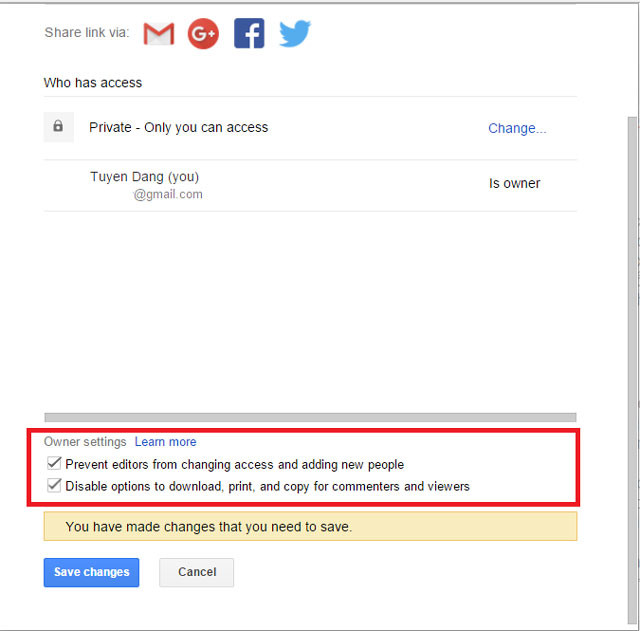 Bạn có thể ngăn không cho tải về hoặc in ấn tài liệu, slideshow hoặc bảng tính của mình chia sẻ với những người khác. Bạn còn có thể ngăn chặn khả năng sao chép văn bản hoặc các thành phần khác. Tính năng hạn chế này hơi khó tìm: Ở cửa sổ "Share with others", trong phần "Advanced".