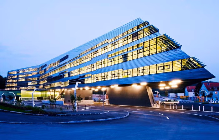 Tòa nhà Cơ điện tử thuộc Công viên khoa học của ĐH Johannes Kepler (JKU) ở thành phố Linz, Áo, gồm 5 tầng. Chiều cao của các tầng trên là 3,22 m trong khi tầng 1 cao đến 6,8 m. Ảnh: JKU.