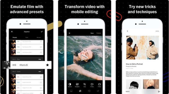 VSCO là ứng dụng chỉnh sửa ảnh sáng tạo với giao diện đơn giản. Chúng cho phép bạn thiết lập các thông số như màu sắc hình ảnh, độ phơi sáng và có sẵn các tính năng chỉnh sửa video bao gồm độ tương phản, cắt gọt và nhiều công cụ khác. Giống như những ứng dụng khác trong danh sách này, bạn có thể tạo, lưu và sử dụng các những thiết lập đặt trước. Tuy nhiên, ứng dụng cung cấp một tính năng độc đáo của mạng lưới các nhà sáng tạo bao gồm cả những nhiếp ảnh gia chuyên nghiệp.