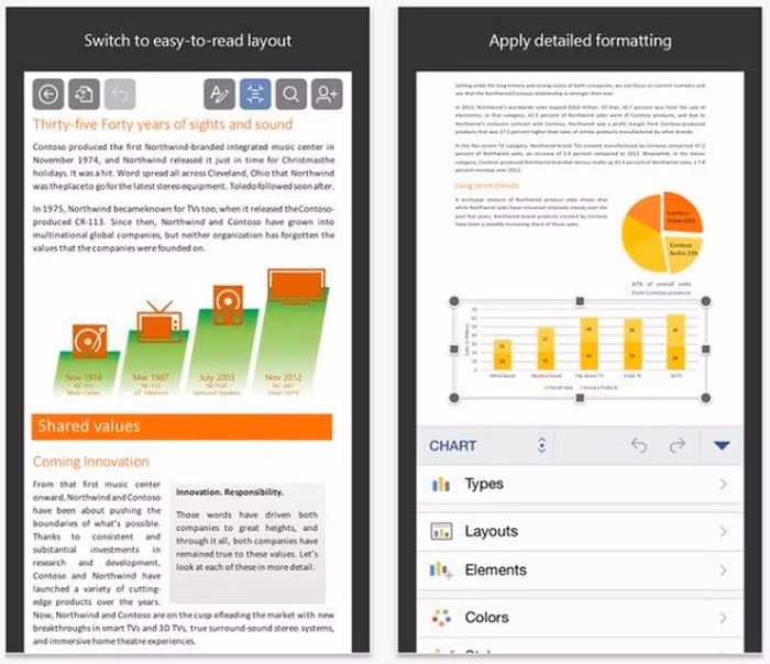 Sử dụng Word thay cho Pages: Ứng dụng soạn thảo Pages của Apple có rất nhiều công cụ hữu ích nhưng không phải lúc nào cũng dễ đọc hoặc định dạng trên màn hình iPhone nhỏ hơn. Mang Word tới iPhone, Microsoft khẳng định rằng, ứng dụng này có chế độ tích hợp để đọc dễ dàng hơn và dễ viết, định dạng các tài liệu, hình ảnh...trên các thiết bị liền mạch.