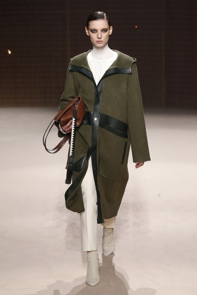 Áo khoác ngoài màu xanh rêu có nút bằng đồng kết hợp với giày to, hầm hố cũng là một xu hướng thường thấy trong các bộ sưu tập năm nay.