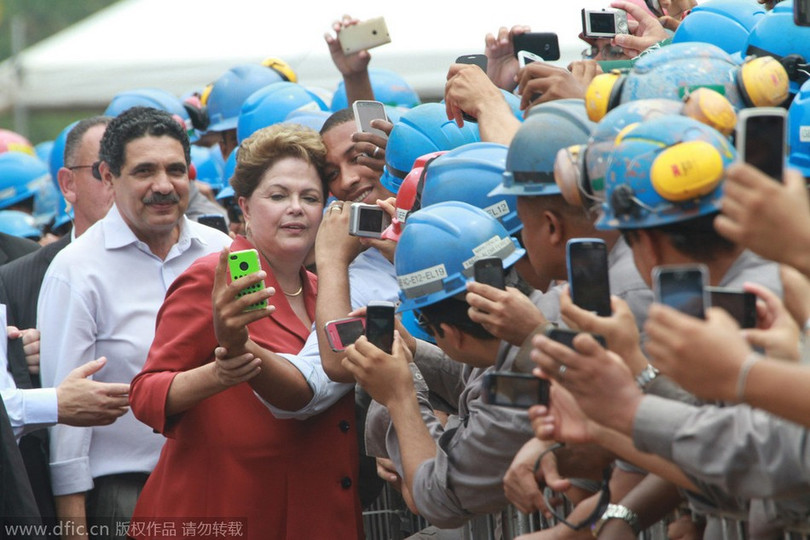 Tổng thống Brazil Dilma Rousseff vui vẻ chụp ảnh chung với các công nhân một xưởng đóng tàu.