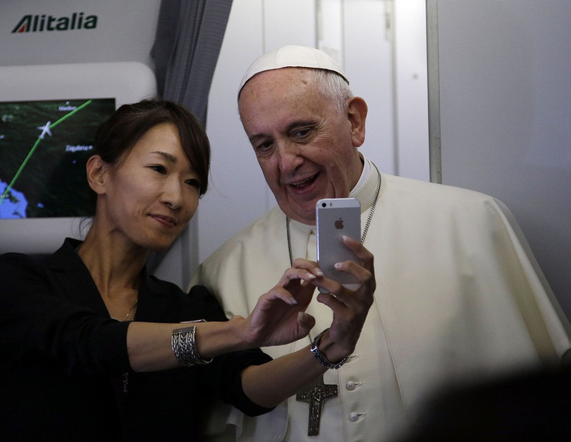 Ngày 13-8-2014, giáo hoàng Francis từ Roma bay sang Hàn Quốc, hơn 70 phóng viên các nước cùng đi với giáo hoàng trong chuyến thăm này. Ảnh dưới là phút chụp chung giữa giáo hoàng Francis và nữ phóng viên Nhật Bản Shoko Ueda.
