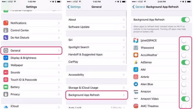 Nếu bạn không sử dụng tính năng này, hãy vào Cài đặt > Cài đặt chung > Làm mới ứng dụng trong nền > và tắt nó đi cho mỗi ứng dụng sử dụng quá nhiều pin. Bạn cũng có thể tắt hoàn toàn nếu không muốn thực hiện với từng ứng dụng riêng lẻ.