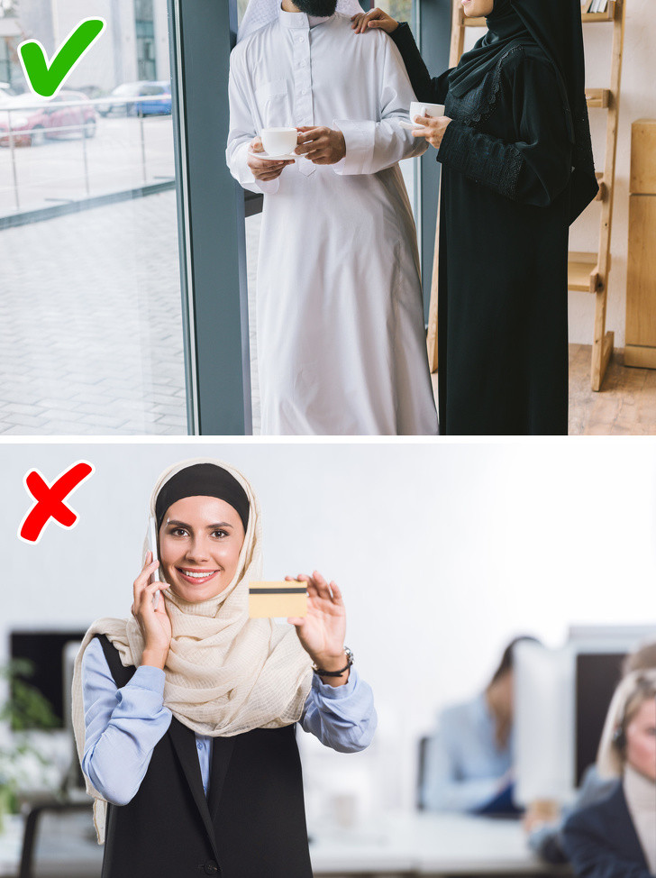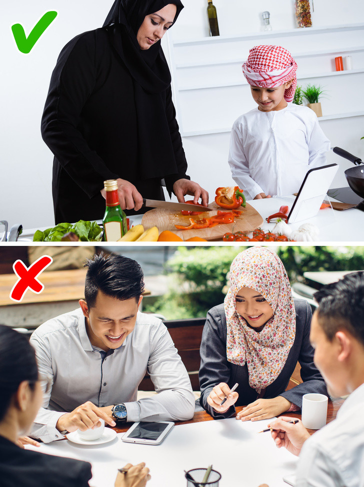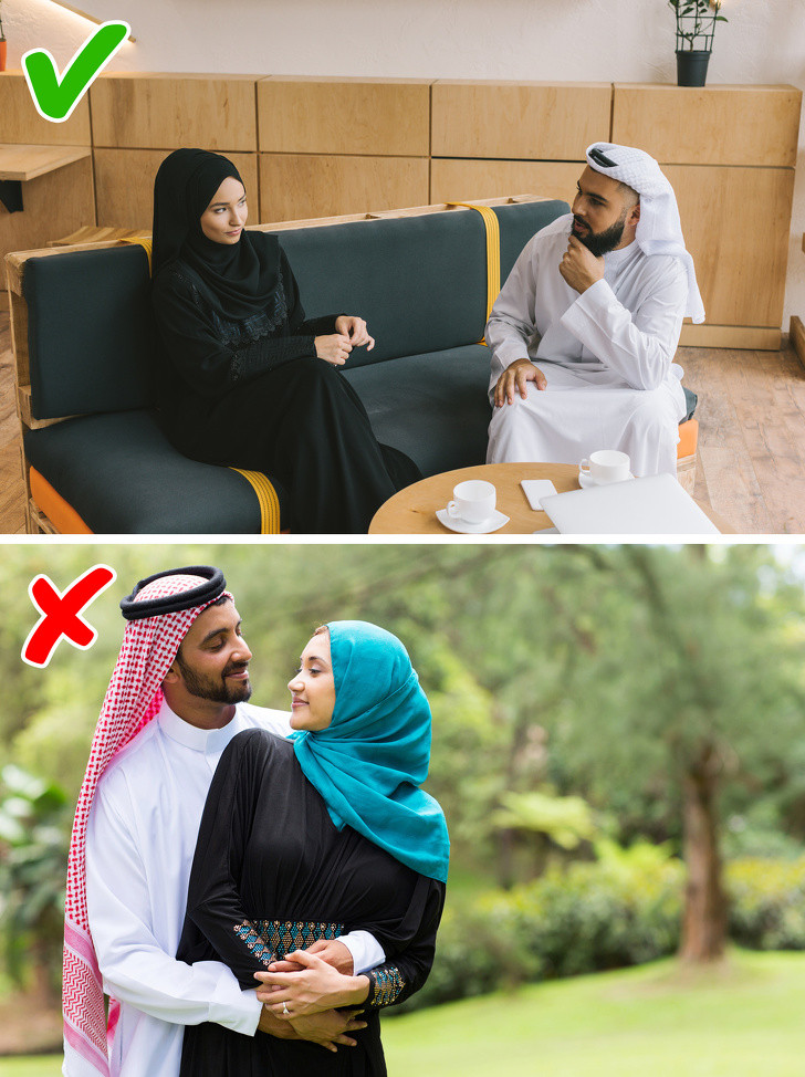 Phụ nữ không bao giờ tiếp khách đến thăm nhà. Ở nhà, họ không phải mặt trang phục theo quy định, do đó, khi người chồng tiếp khách, họ phải né đi chỗ khác thậm chí nếu có việc muốn nói với chồng, học phải thông qua điện thoại!