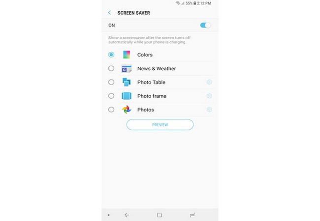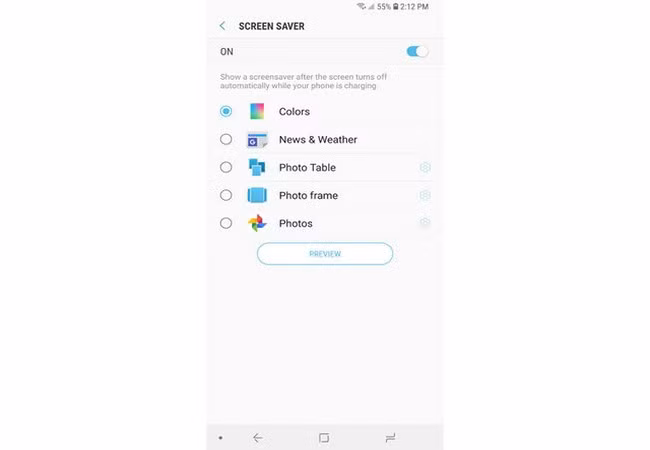 Vào Settings > Display > Screen saver > chọn trình screensaver bạn thích (Cài đặt > Màn hình > Screen saver). Bạn có thể xem trước các trình screen saver trước khi quyết định chọn.