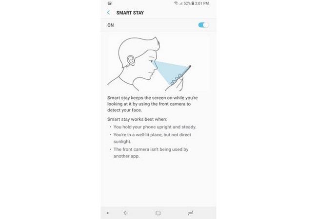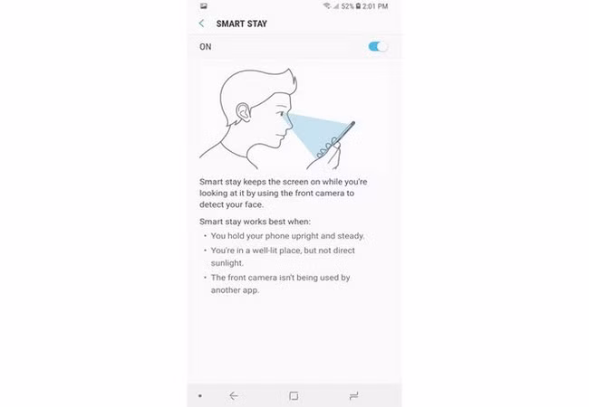 Tính năng này cũng có trên một số loại điện thoại của Samsung. Đây được gọi là Smart Stay, và tính năng này giúp camera trước kiểm tra xem bạn có nhìn vào màn hình không. Nếu bạn đang nhìn vào màn hình, nó sẽ giữ cho màn hình luôn mở vì vậy bạn không phải thỉnh thoảng chạm vào màn hình.