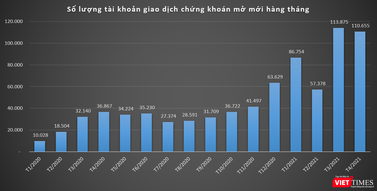 VietTimes – Trong tháng 4/2021, nhà đầu tư cá nhân trong nước đã mở mới thêm 109.998 tài khoản, tăng gấp 3 lần cùng kỳ năm trước.