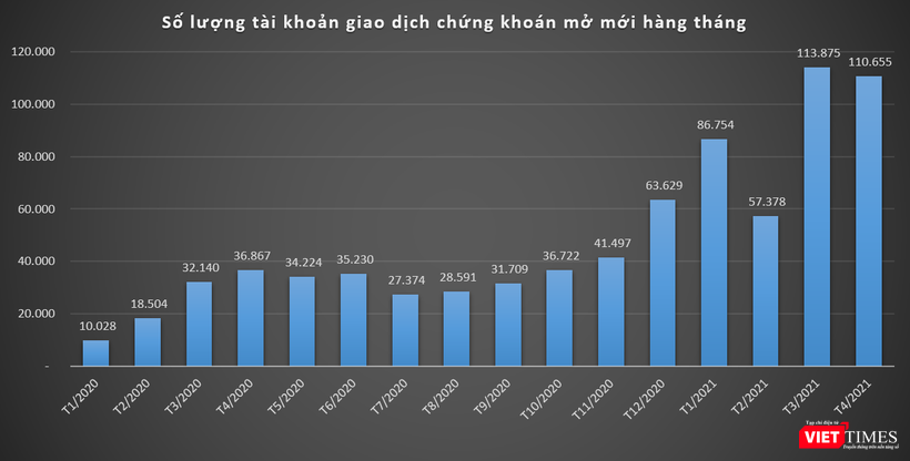Trong đó, số lượng tài khoản mở mới của nhà đầu tư cá nhân trong nước trong tháng 4/2021 là 109.998 tài khoản, gấp 3 lần so với cùng kỳ năm ngoái, giảm nhẹ so với tháng 3/2021 (113.191 tài khoản) và là tháng thứ 2 liên tiếp nhà đầu tư cá nhân trong nước mở mới trên 100.000 tài khoản.