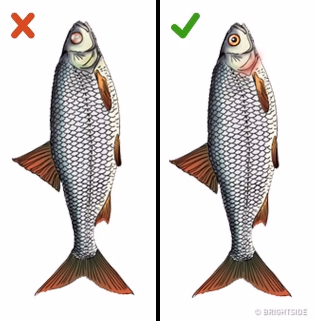 Một con cá tươi có mắt sáng; mắt mờ và phồng lên là dấu hiệu của một con cá ươn. Mang cá phải có màu đỏ tươi hoặc màu hồng nhạt (trong trường hợp máu chảy qua mang).