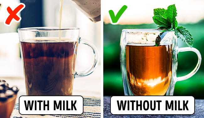 Các nhà khoa học phát hiện ra rằng chất casein có trong sữa sẽ làm giảm các lợi ích lành mạnh của trà. Thành phần trong trà có ảnh hưởng tích cực đến chức năng của hệ thống tim mạch và ngăn ngừa tốt nhất bệnh đột quỵ. Bạn chỉ nên cho thêm một vài lá bạc hà vào trà để tăng một chút hương vị.