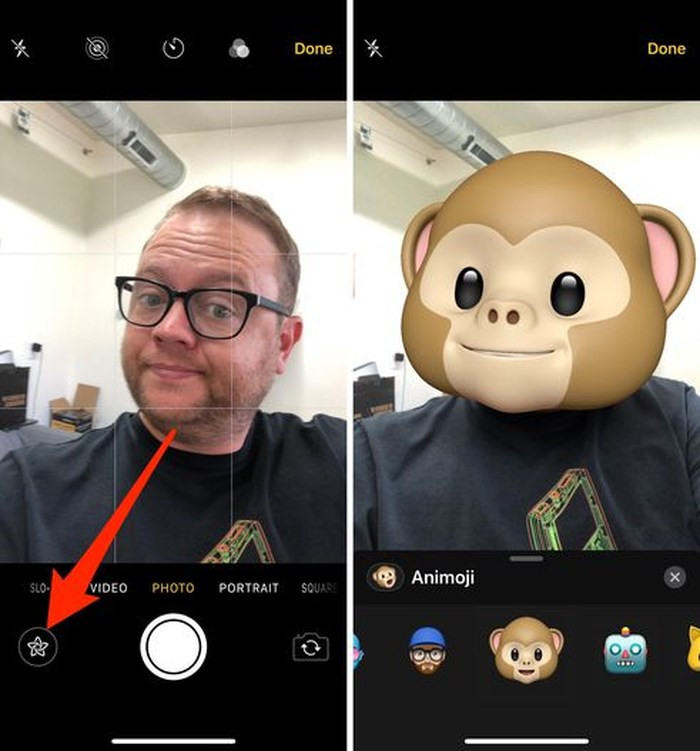 Camera tin nhắn: Khi bạn sử dụng camera trong ứng dụng Messages, ứng dụng camera sẽ có một chút khác biệt. Một biểu tượng mới ở bên trái của nút chụp sẽ mở trang hiệu ứng camera và bạn có thể sử dụng Animoji / Memoji, vẽ hoặc viết chữ lên trên một bức ảnh hoặc video. Chức năng này rất giống với việc sử dụng Facebook Messenger hoặc Instagram.