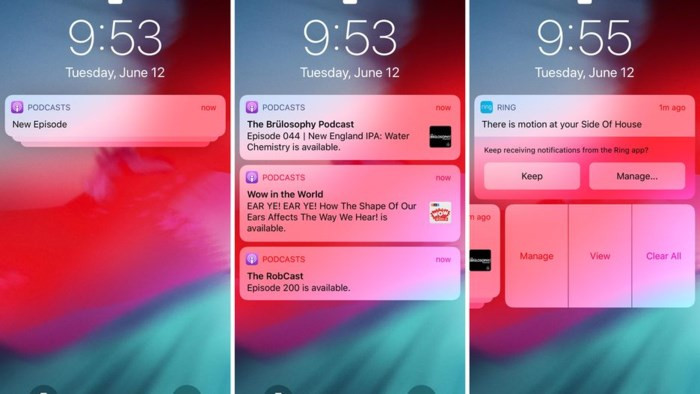 Quản lý thông báo tốt hơn: Các thông báo từ cùng một ứng dụng hiện được xếp chồng lên nhau thay vì được hiển thị trong danh sách dài. Chạm vào một ngăn cảnh báo để mở nó và sau đó tương tác với các thông báo riêng lẻ. Một tính năng mới khác là khả năng vuốt sang trái trên một cảnh báo rồi chạm vào Manage để có được các tùy chọn quản lý các thông báo trong tương lai từ ứng dụng mà bạn không phải tìm hiểu thông qua phần Settings.