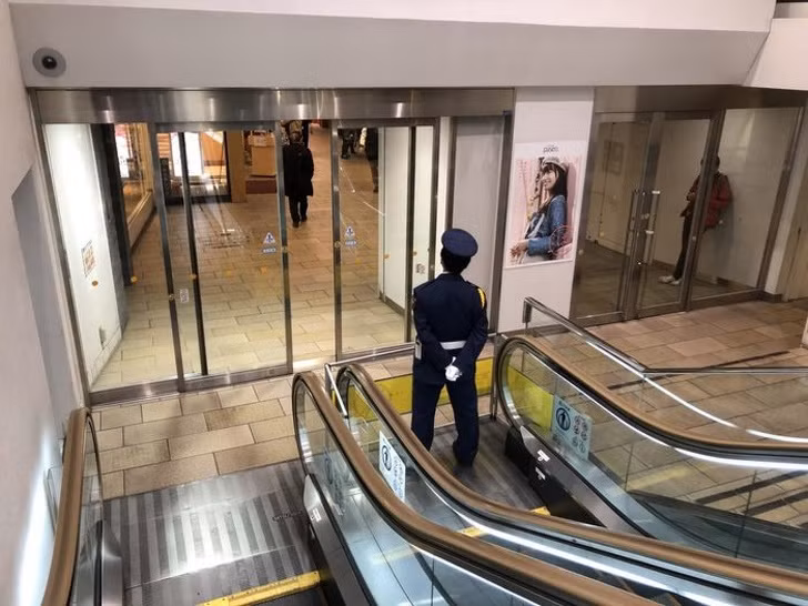 2. Một nhân viên đang bảo vệ thang cuốn bị hỏng