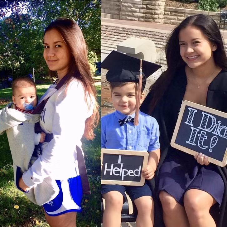 6. Hình ảnh người mẹ đơn thân vào năm 2012 - năm thứ hai đại học; và vào năm 2016, cô ấy tốt nghiệp đại học.