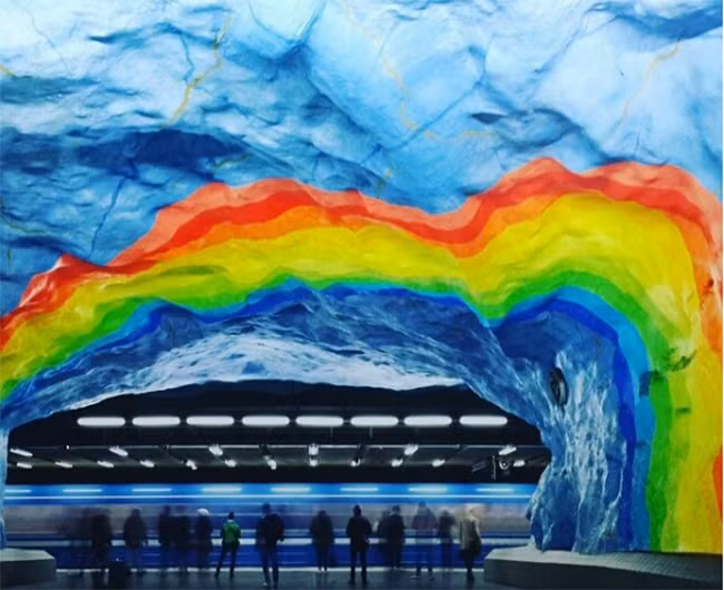 Ga tàu điện ngầm Stockholm là một trong những ga không bình thường nhất trên thế giới. Nó trông vừa giống như một hang động vừa giống như một bảo tàng. Tại một trong các trạm, bạn có thể thấy đôi ủng của người khổng lồ trên trần nhà, ở các trạm khác bạn lại thấy nó được sơn như cầu vồng, một số trạm lại như triển lãm. Ga tàu điện ngầm này là một trong những phòng trưng bày nghệ thuật dài nhất thế giới.