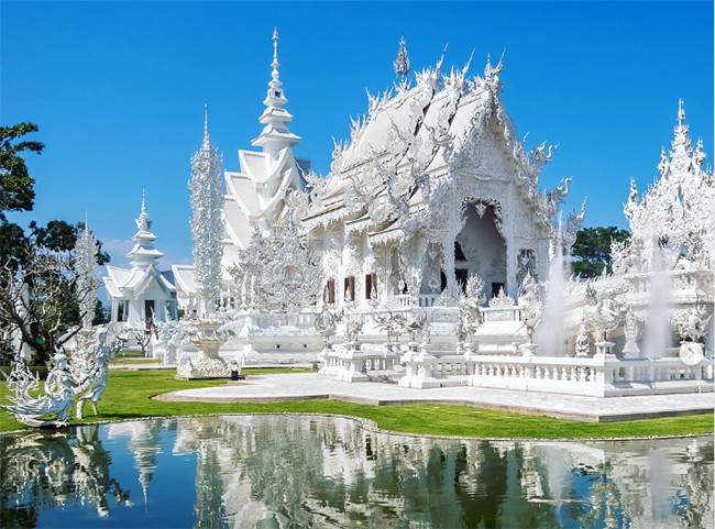 Đền Trắng, Wat Rong Khun nằm không xa Chiang Rai và trông rất giống một cung điện băng. Đền được xây dựng cách đây không lâu – khoảng năm 1997. Con đường đến ngôi đền, như tác giả nói, là con đường từ địa ngục đến thiên đàng và có hàng chục những bàn tay trên con đường tượng trưng cho sự cám dỗ và hoài nghi.