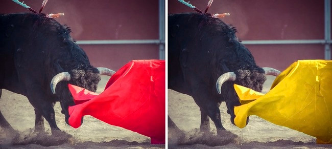 Thực tế, bò đực không thấy màu sắc, chúng chỉ thấy chuyển động. Chúng sẽ bị kích thích khi nhìn thấy một mảnh vải trước mặt.