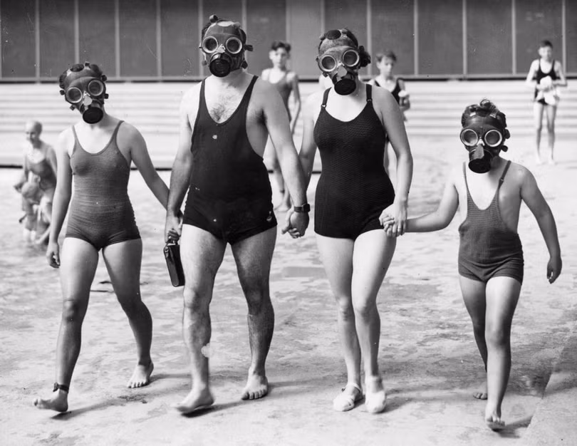 Một gia đình trước chiến tranh đeo mặt nạ khí tại hồ bơi. Mặt nạ khí được cấp cho người dân Anh để lường trước cuộc chiến với Đức.