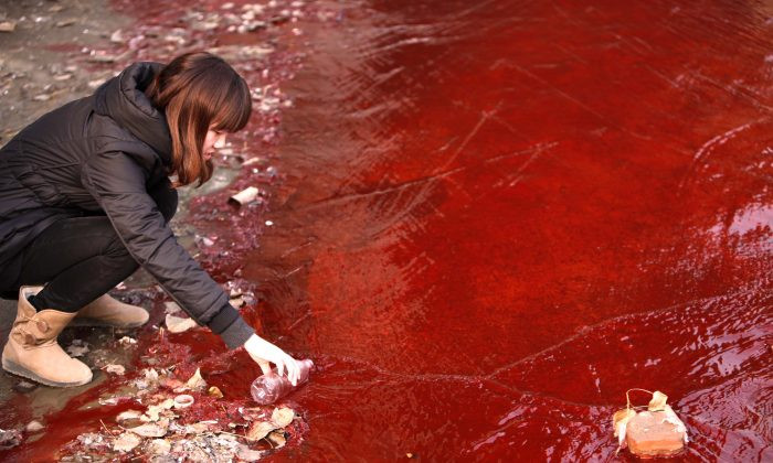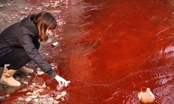 Bức ảnh này là của một con sông ô nhiễm tại thành phố Lạc Dương, tỉnh Hà Nam, Trung Quốc, được đưa vào ngày 13/12/2011. Chính quyền giải thích rằng ô nhiễm do 2 nhà máy hóa chất bất hợp pháp xả rác thải công nghiệp chưa qua xử lý ra ngoài môi trường.