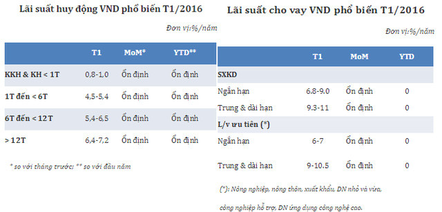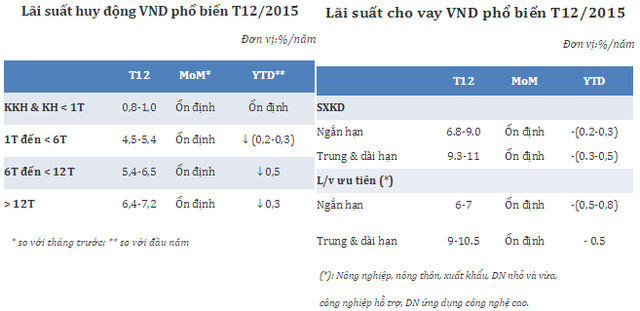 Trên thực tế, mặt băng lãi suất cho vay bằng VND phổ biến của toàn hệ thống tiếp tục ổn định trong tháng 12/2015 và 15 ngày đầu tháng 1/2016.