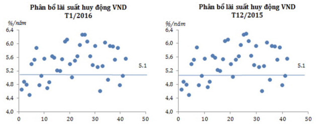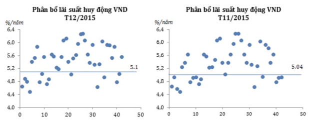 Sau điều chỉnh, lãi suất của các ngân hàng này vẫn nằm trong vùng trung bình so với mặt bằng phổ biến của toàn thị trường (khoảng 5-5,3%/năm đối với kỳ hạn dưới 6 tháng; 6,4-7,0%/năm đối với kỳ hạn trên 6 tháng). Do đó, nếu tính trung bình toàn hệ thống, lãi suất huy động bình quân gia quyền trong tháng 12/2015 ở mức 5,1%/năm, chỉ cao hơn 0,06%/năm so tháng trước đó.