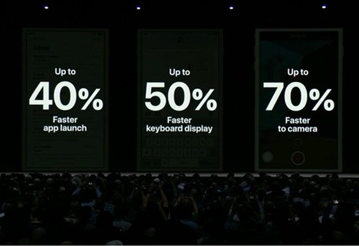 1. Tăng tốc iPhone cũ. Theo Apple, iOS 12 giúp cho các dòng điện thoại cũ như iPhone 6+ trở nên nhanh chóng hơn nhiều: mở ứng dụng nhanh hơn 40%, mở bàn phím nhanh hơn 50%, và cải thiện 70% tốc độ mở máy ảnh.