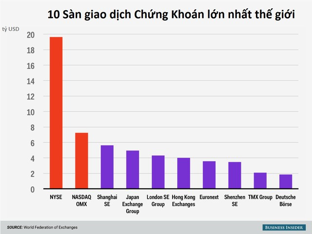Tổng số vốn cổ phần hóa của sàn NYSE và sàn NASDAQ lớn hơn tổng 6 sàn sếp sau cộng lại
