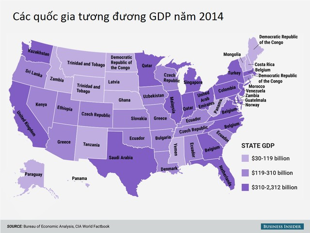 Đây là hình ảnh bản đồ nước Mỹ trong đó từng bang được so sánh với một quốc gia trên thế giới.