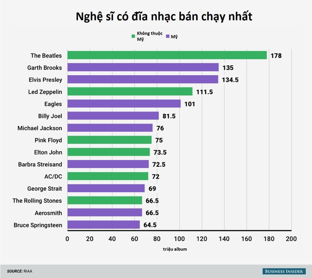 Mỹ chiếm 9 trên 15 nghệ sĩ có các sản phẩm âm nhạc bán chạy nhất mọi thời đại