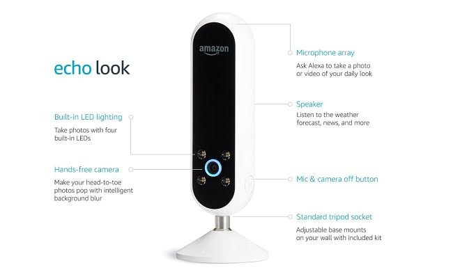 Echo Look của Amazon chủ yếu hoạt động như một camera selfie thông minh tích hợp đèn LED với thiết kế hình ô van. Bằng cách dùng khẩu lệnh, người sử dụng có thể chụp ảnh toàn thân và quay video ngắn bằng camera rảnh tay đồng thời nhận được tư vấn từ trợ lý ảo Alexa.