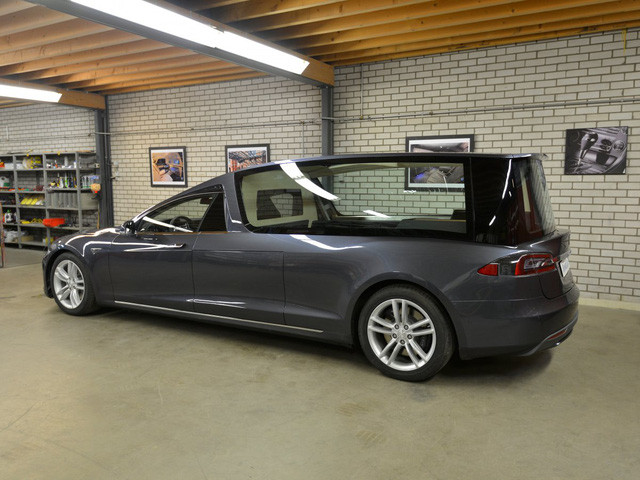9. Một công ty Hà Lan bất ngờ biến đổi diện mạo chiếc Tesla Model S trở thành một chiếc... xe tang. Cụ thể, dịch vụ vận chuyển tang lễ Vander der Lans & Busscher BV đã hợp tác với hãng xe limousine RemetzCar trong suốt 8 tháng để cho ra đời sản phẩm này.